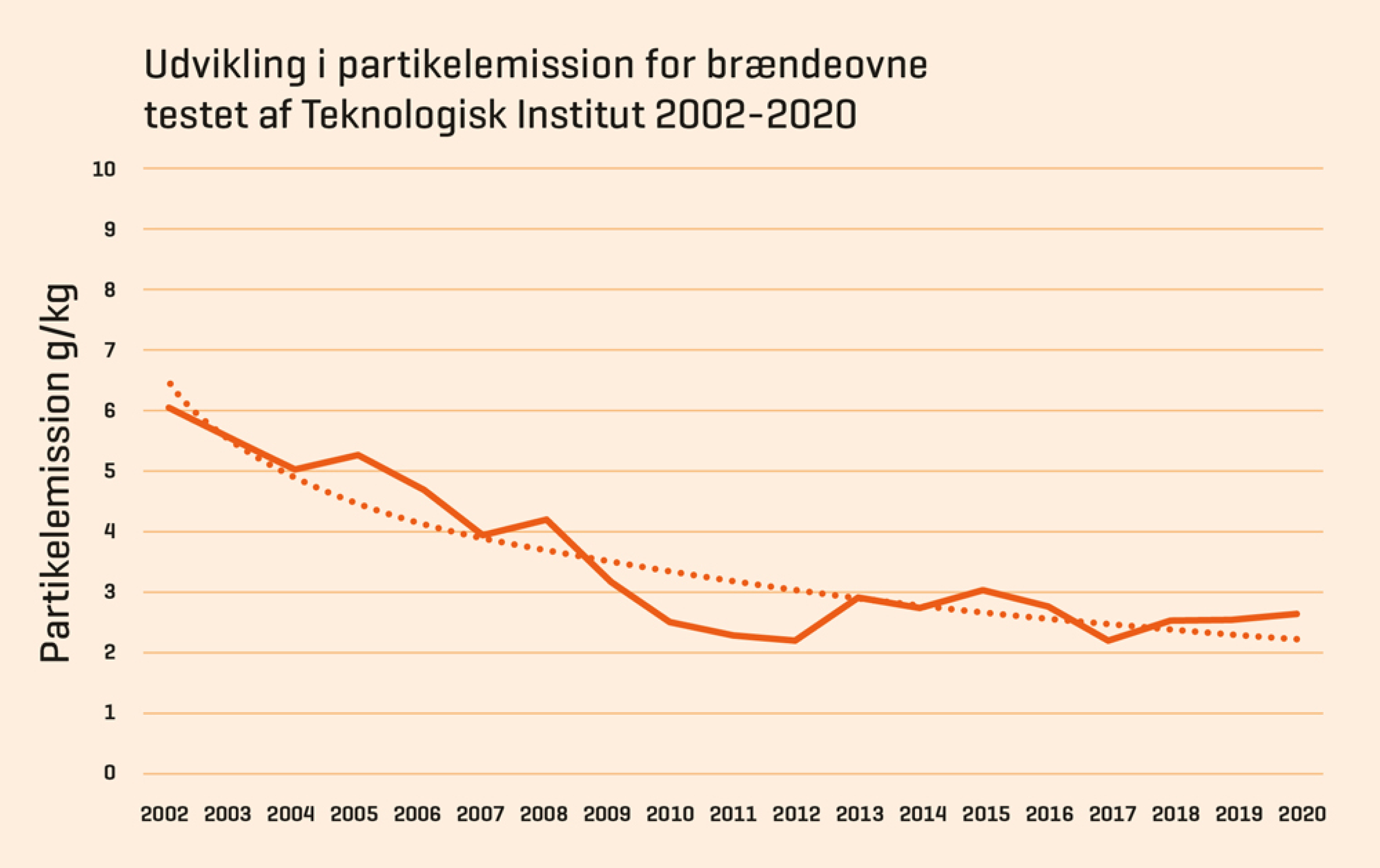Udviklingen i partikelemissionen for brændeovne er blevet testet hos Teknologisk Institut i perioden 2002 til 2020.